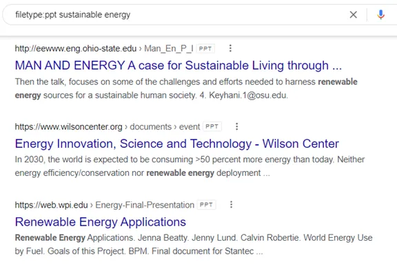 In the case of wanting to find a PowerPoint on sustainable energy, you could use the following in the search bar: filetype:ppt sustainable energy.