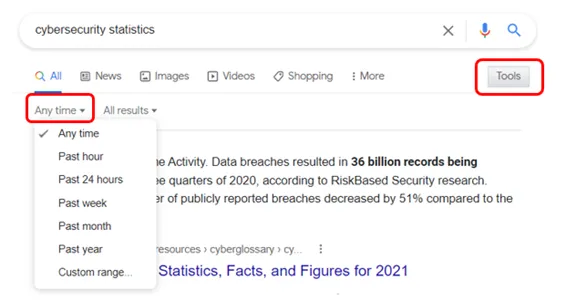 One frustration is when you’re looking up something like a population or cybersecurity statistic and you end up with results that are too old to be relevant. You can spend valuable time paging through the search results, or you can tell Google what time frame you’d like to search.