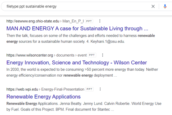 In the case of wanting to find a PowerPoint on sustainable energy, you could use the following in the search bar: filetype:ppt sustainable energy.